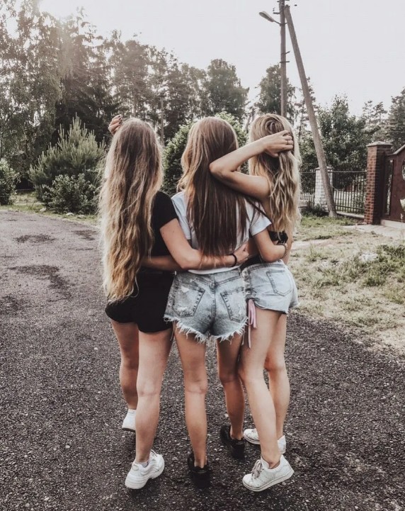Девушки с длинными волосами в джинсовых шортиках